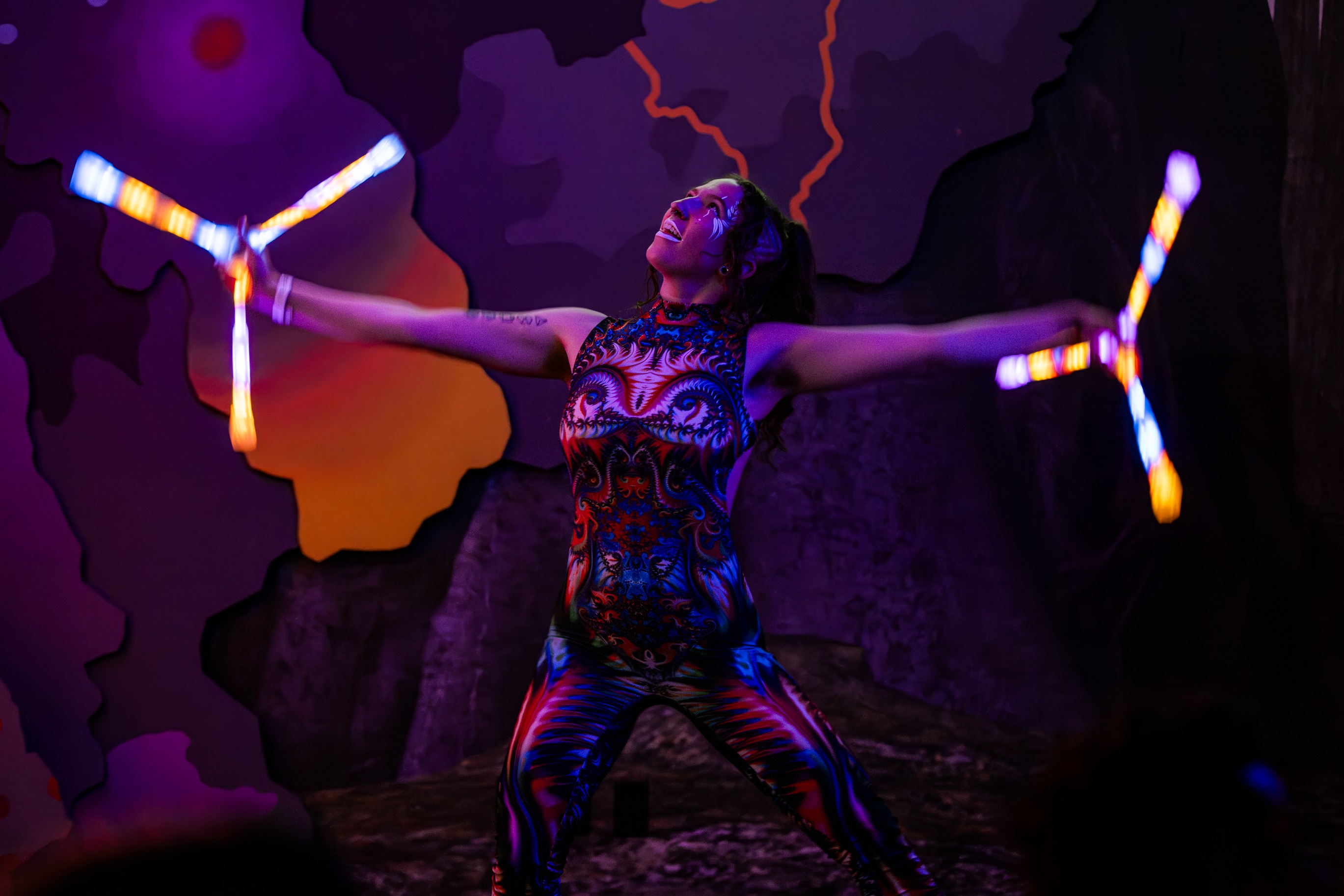 The Danceportation Music Festival at Meow Wolf Denver showcased a diverse lineup that flowed seamlessly from introspective ambiance to high-energy euphoria. Wolfie Fenix opened the day with smooth R&B-infused electronica, immediately drawing the crowd into a dreamy, immersive soundscape. Spella followed with a soulful, atmospheric set that layered emotive vocals over downtempo beats, creating a deeply intimate experience. Mr. Frick shifted the energy with his genre-blending performance—playful, funky, and experimental—turning his corner of Meow Wolf into a dance-fueled escape. Blossom Reynolds offered a moment of serenity, her ethereal set providing a meditative pause amid the festival’s sensory overload.