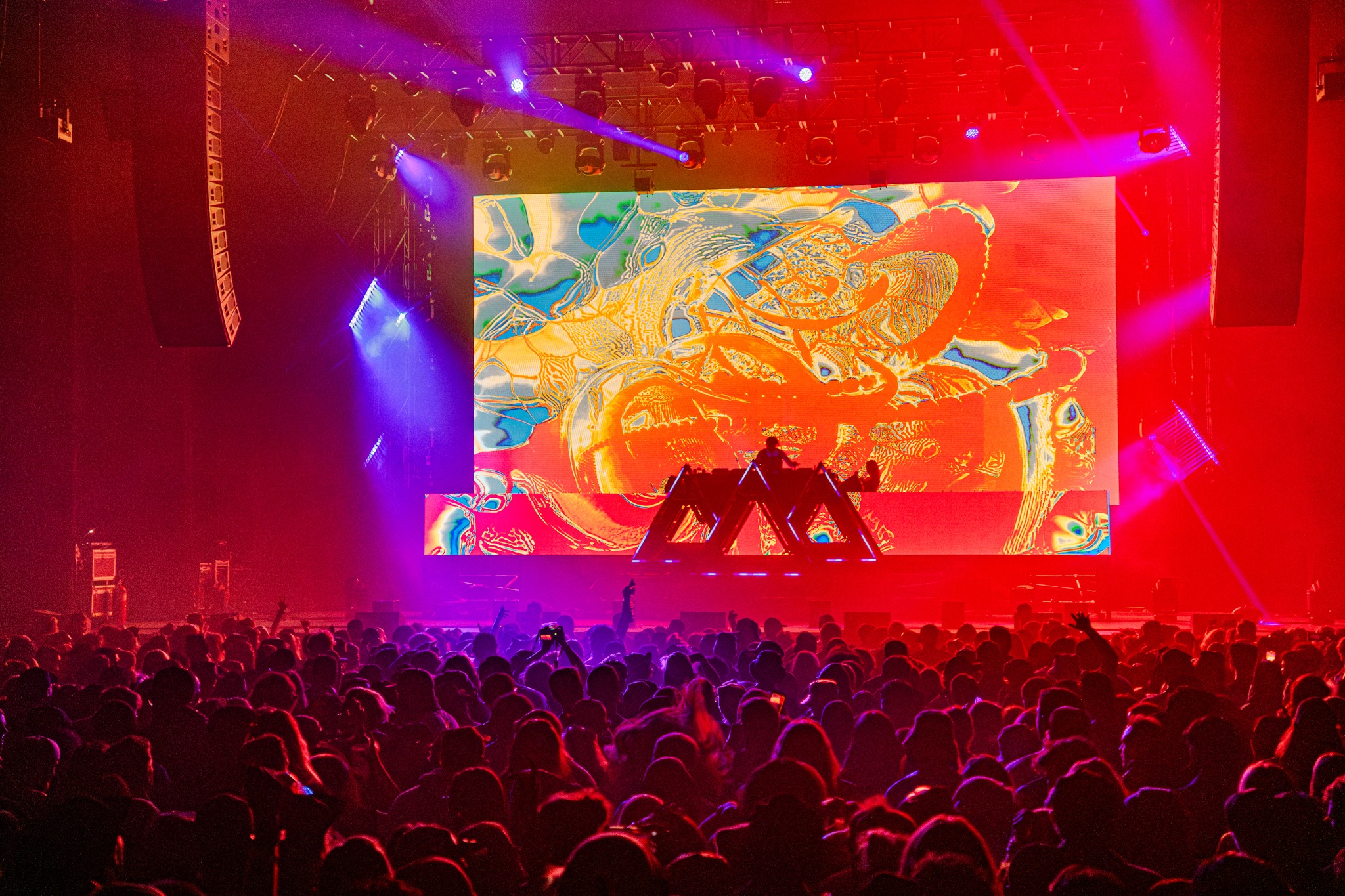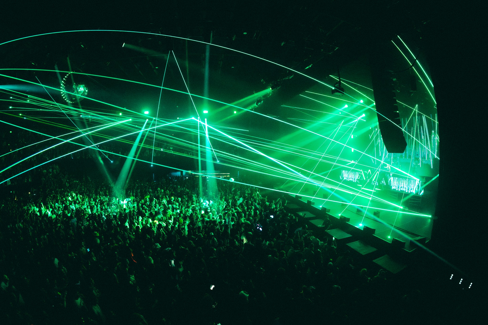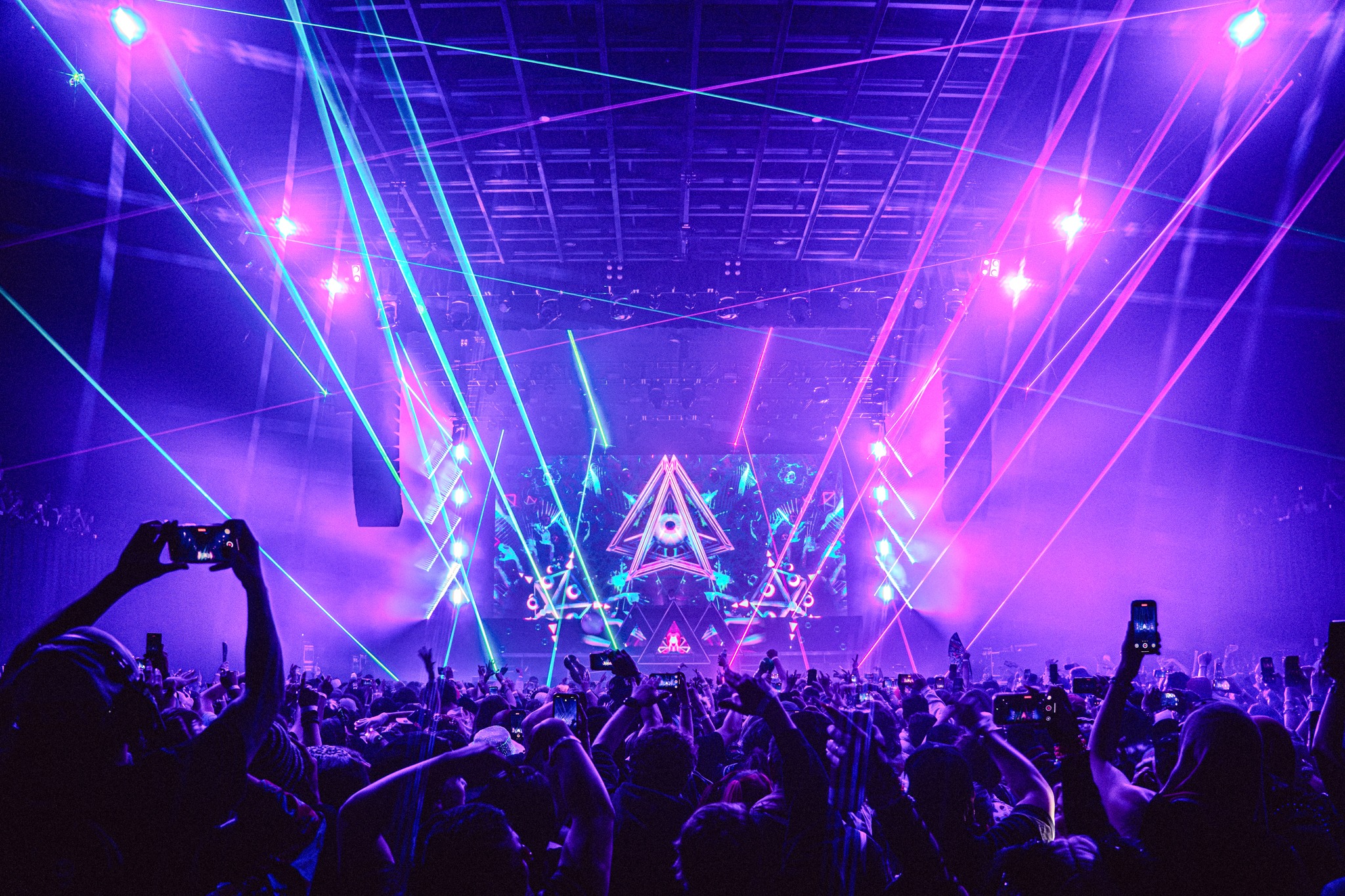 When his eight added subwoofers kicked in, the air practically shoved bodies back—rattling the ballroom and shaking us to our core. The intensity was matched by an over-the-top, meticulously crafted stage design and production. At the center: the symbol of Wakaan, Martin’s music label founded in 2015. Lasers and lights were everywhere—four full laser rigs, eight par lights suspended above the crowd, massive LED screens in front of and behind the booth—and yes, fire. Between the heat of the tracks and the literal fireballs erupting at the front of the stage, the crowd was sweating. It was absolutely sick.