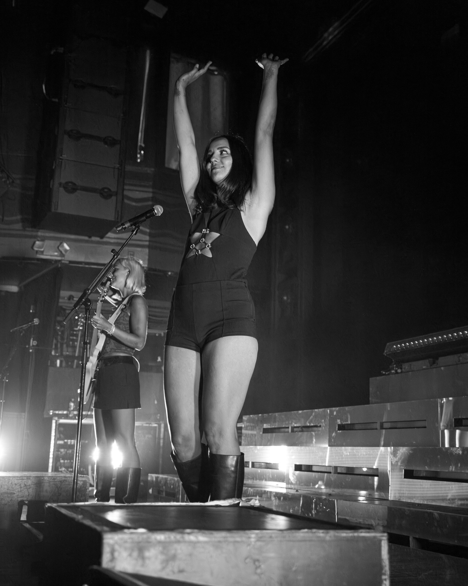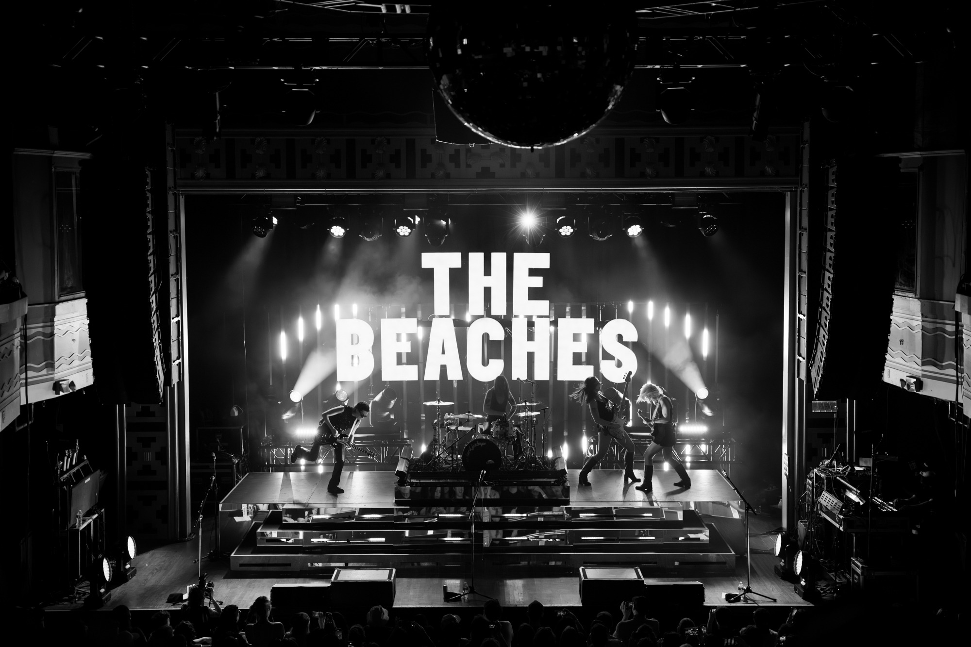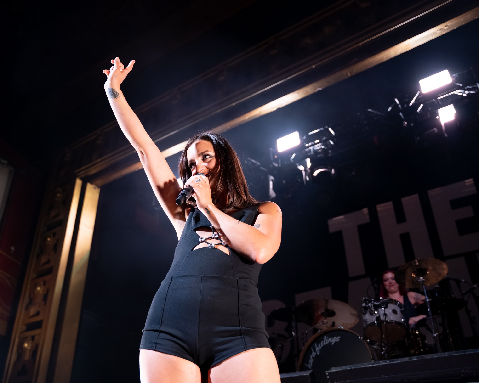 Walking on stage after an audio recording of a personal voicemail, the crowd screamed as Jordan, Kylie, Eliza, and Leandra ran onto stage. Counting down from eight into “Last Girls at the Party” the room became electric. Under deep blue lights, Jordan leapt onto the stage monitors, kneeling and engaging with everyone in the front row. A true frontwoman, she controlled the crowd from countdown to the end of the show by running up and down their elevated stage levels, flipping her hair as she belted each song. Kylie and Leandra, on either side of the stage, also had their fair share of movement and interaction with the crowd!