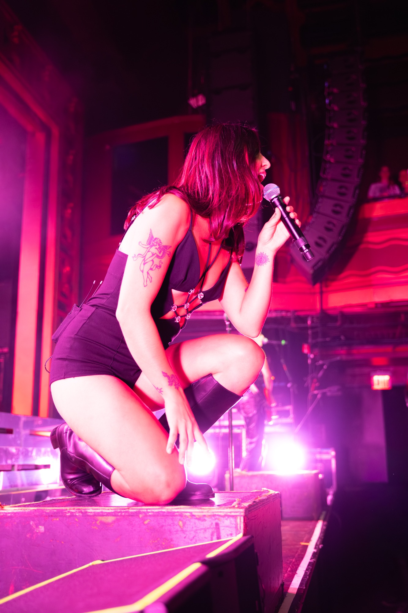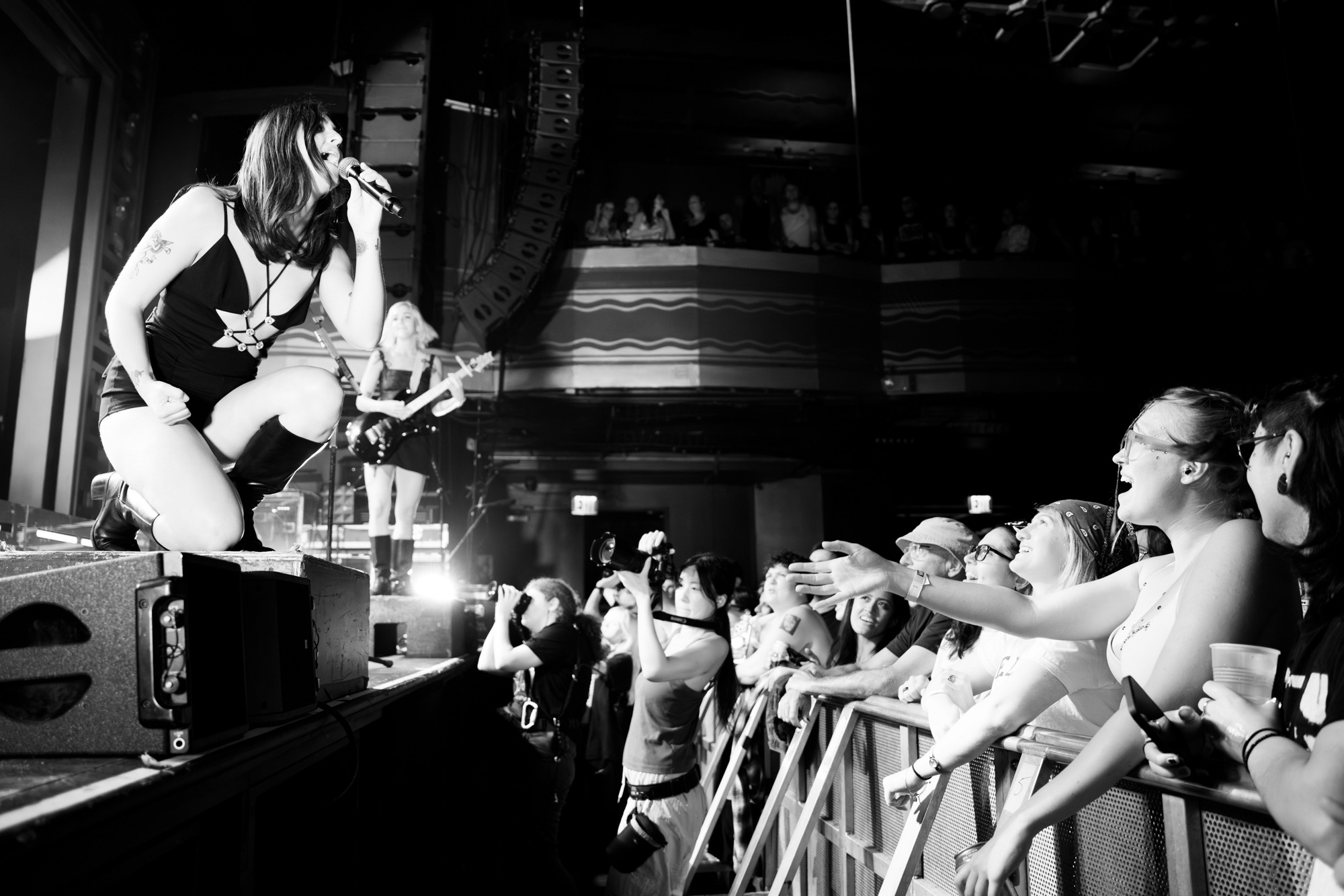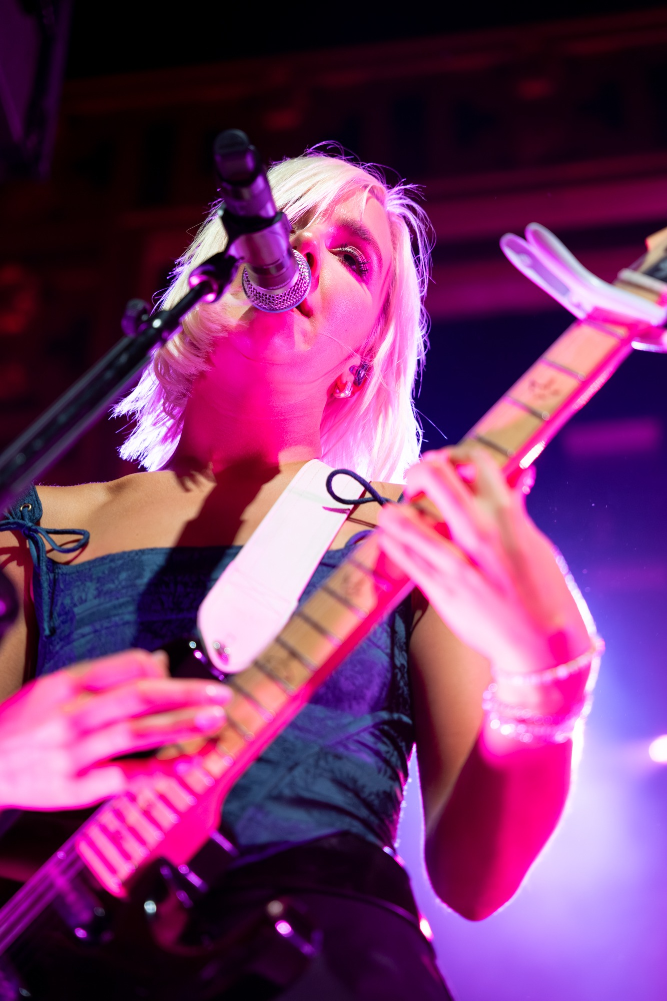Walking on stage after an audio recording of a personal voicemail, the crowd screamed as Jordan, Kylie, Eliza, and Leandra ran onto stage. Counting down from eight into “Last Girls at the Party” the room became electric. Under deep blue lights, Jordan leapt onto the stage monitors, kneeling and engaging with everyone in the front row. A true frontwoman, she controlled the crowd from countdown to the end of the show by running up and down their elevated stage levels, flipping her hair as she belted each song. Kylie and Leandra, on either side of the stage, also had their fair share of movement and interaction with the crowd!